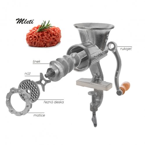 Mlynček na mäso PORKERT na prípravu sekanej, fašírok, mäsa na špagety a iných pokrmov z mletého mäsa. Mlynčeky majú certifikát zdravotnej nezávadnosti, sú povrchovo upravené hrubou vrstvou potravinárskeho cínu. Mimoriadne vysoká životnosť. Mletie je ľahké a jednoduché. Všetky diely sú vyrábané v Českej republike. K stolu pripevníte pomocou klasickej skrutky. Gumová podložka zabráni poškodeniu pracovnej dosky. Veľkosť 5. Jednoduchá montáž a demontáž, jednoduchá údržba. Celková výška od stola 14 cm, násypka 9x7 cm, vhodný na dosky do max. hr. 4 cm, priemer kolieska 6 cm, priemer otvorov 0.4 cm. Nie je vhodný do umývačky riadu. EAN 8595017301001