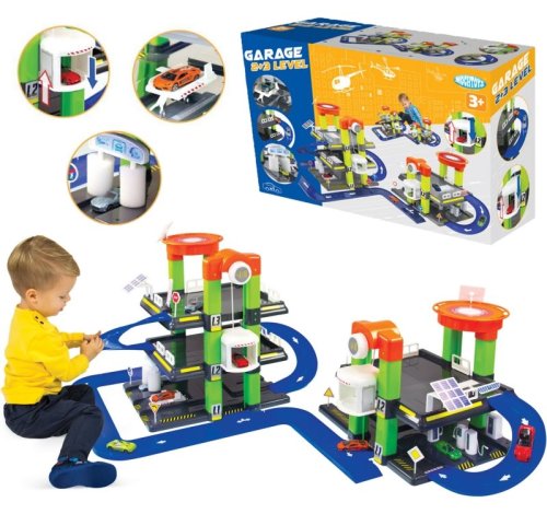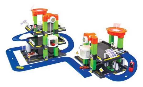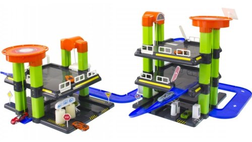 Dve moderné dvojpodlažné a trojpodlažné parkoviská sú prepojené ulicou s dopravnými značkami a semaformi. Choďte výťahom do požadovanej úrovne garáže a zaparkujte na parkovacom mieste. Keď sa vaše auto zašpiní, navštívte umývačky áut. Pri odchode doplňte plnú nádrž , aby vám na trase nedochádzalo palivo. Súprava obsahuje: