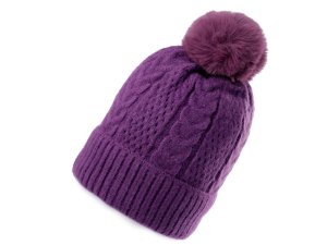 Pletená čiapka s veľkým kožušinovým brmbolcom a vyhrnutým okrajom má zaujímavú štruktúru.