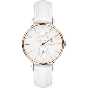Dámske náramkové hodinky Napájanie z batérie Strojček SEIKO VX3P Priemer puzdra 36,0 mm Puzdro v tvare kruhu Oceľové puzdro Zlatistá farba puzdra Kožený ťah Biela farba ťahu Ručičkový ciferník Šedá farba …