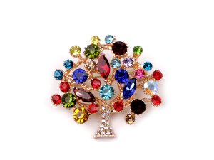 Elegantná kovová brošňa strom života je veľmi výrazná, upúta na prvý pohľad trblietavými brúsenými kamienkami.