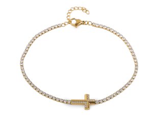 Náramok z nerezovej ocele upúta pozornosť brúsenými kamienkami po celej dĺžke a krížikom.
