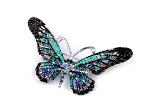 Elegantná brošňa v tvare motýľa je neprehliadnuteľná.