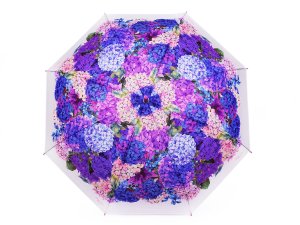Priesvitný dáždnik s potlačou hortenzií je vystreľovací, konštrukciu má z kovového drôtu a pružných lamiel, ktoré tvoria osem polí.