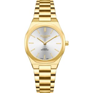 Dámske náramkové hodinky Napájanie z batérie Priemer puzdra 33,0 mm Puzdro v tvare štvorca Kovové puzdro Zlatistá farba puzdra Kovový ťah Zlatistá farba ťahu Ručičkový ciferník Strieborná farba ciferníka …