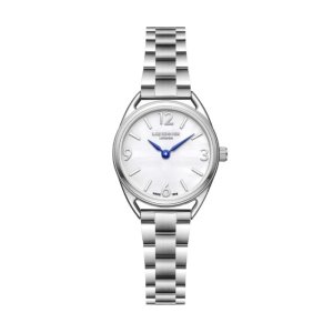 Dámske náramkové hodinky Napájanie z batérie Priemer puzdra 26,0 mm Puzdro v tvare kruhu Kovové puzdro Strieborná farba puzdra Kovový ťah Strieborná farba ťahu Ručičkový ciferník PERLEŤOVÁ farba ciferníka …