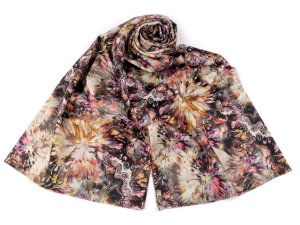 Šál s abstraktnými motívmi je mäkký, husto tkaný, vyrobený z materiálu príjemného na dotyk.
