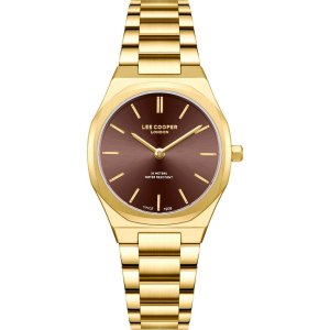 Dámske náramkové hodinky Napájanie z batérie Priemer puzdra 33,0 mm Puzdro v tvare štvorca Kovové puzdro Zlatavá farba puzdra Kovový ťah Zlatavá farba ťahu Ručičkový ciferník Hnedá farba ciferníka …