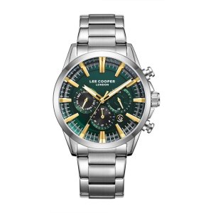 Pánske náramkové hodinky Napájanie z batérie Priemer puzdra 43,0 mm Puzdro v tvare kruhu Kovové puzdro Strieborná farba puzdra Kovový ťah Strieborná farba ťahu Ručičkový ciferník Zelená farba ciferníka …