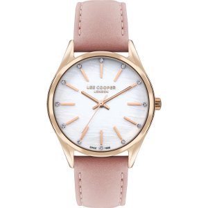 Dámske náramkové hodinky Napájanie z batérie Priemer puzdra 36,0 mm Puzdro v tvare kruhu Kovové puzdro Ružové zlato farba puzdra Kožený ťah Ružová farba ťahu Ručičkový ciferník PERLEŤOVÁ farba ciferníka …