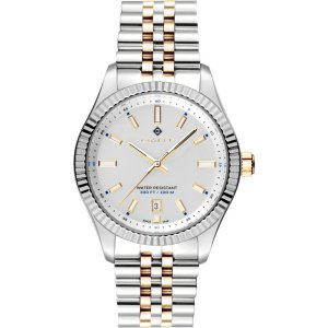Dámske náramkové hodinky Napájanie z batérie Strojček MIYOTA 2115 Priemer puzdra 37,5 mm Puzdro v tvare kruhu Oceľové puzdro Strieborná farba puzdra Oceľový ťah Strieborná/zlatá farba ťahu Ručičkový ciferník …