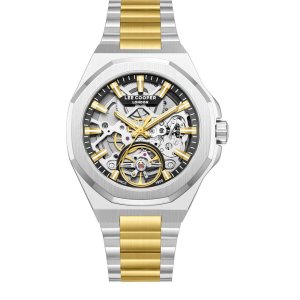 Pánske náramkové hodinky Mechanický pohon Priemer puzdra 44,0 mm Puzdro v tvare kruhu Kovové puzdro Strieborná farba puzdra Kovový ťah Strieborná/zlatá farba ťahu Ručičkový ciferník Ciferník s dvanástimi …