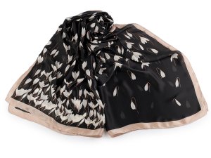 Elegantný saténový šál s kvetmi je ľahučký a mäkký, na dotyk pripomína hodváb.