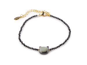Náramok z brúsených korálikov je ozdobený perleťovým korálikom mačky.