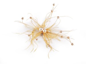 Veľká elegantná brošňa je ozdobená perlami, brúsenými korálkami a nadýchaným pštrosím perím.