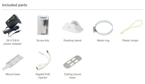 Prístupový bod je potom dodávaný s kompletným príslušenstvom pre montáž na stenu, strop či stĺp , takže už nemusíte čokoľvek dokupovať. Súčasťou dodávky tak je 24V/0,8A napájací adaptér, držiak na stôl, kovová páska, sťahovacia plastová páska, kovový úchyt na stenu, GbE PoE injektor, kovový úchyt na strop, sada skrutiek a užívateľský návod