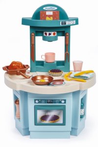 Kompaktná kuchynka v azúrovej farbe na hranie má rúru, sporák s dvoma horákmi, drez s kohútikom a rôzne police a háčiky na uloženie príslušenstva. Kuchynské doplnky zahŕňajú panvicu so sadeným vajcom, pekáč s vyprážaným kuraťom, náčinie na pečenie, tanier s príbormi, pohár, hrnček, mlynček na korenie, krabička na cestoviny, fľašu vody a tortu ako dezert. Celkom 18 doplnkov. Rozmery kuchynky (DxŠxV): 43,5 x 27 x 60 cm.