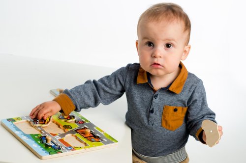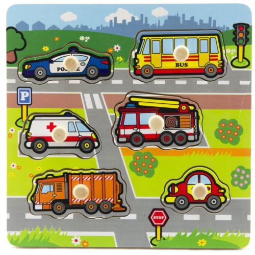 Obsahuje 6 dielikov s úchytmi, ktoré musia deti správne umiestniť do drevenej dosky s otvormi tak, aby získali obrázok cesty s autami. Veľkosť: 22,5 x 22,5 x 2,5 cm Vhodná od 12 mesiacov.