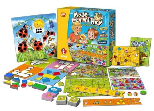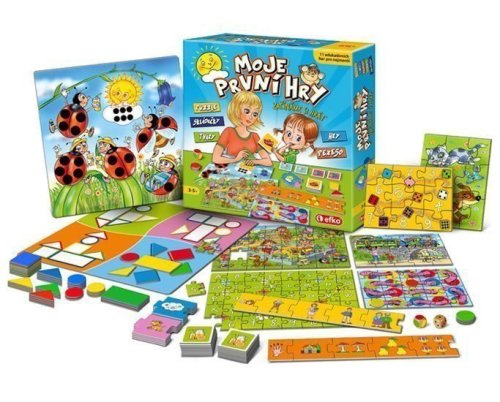 Hrajte sa s deťmi alebo ich nechajte, nech sa hrajú, spoznávajú a objavujú samy! S puzzle si deti zlepšia jemnú motoriku a postreh a vďaka obojstrannej potlači spoznajú abecedu aj základné číslovky. S farebným lotom si precvičia tvary a základné farby, ktoré si zopakujú pri populárnej hre „Žížalky“. Pri skladačkách zase narazia deti na základy logiky a pamäť si precvičia s kvalitnými kartičkami pexesa. Jednotlivé prvky môžu byť navzájom previazané a vďaka tomu môžete vytvoriť ďalšie hry a ich varianty. Spoločenská hra pre deti od českého výrobcu EFKO. Hra obsahuje: - herný plán pre 2 hry (Slunéčko, Loto), - 3 obojstranné puzzle (9, 20 a 40 dielikov), - pexeso (24 obrázkov), - farebné tvary (štvorčeky, obdĺžniky, trojuholníčky, kolieska), - logické skladačky, - 2 kocky (bodkovaná, farebná).