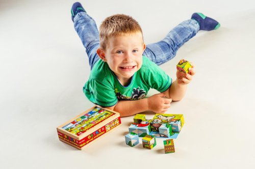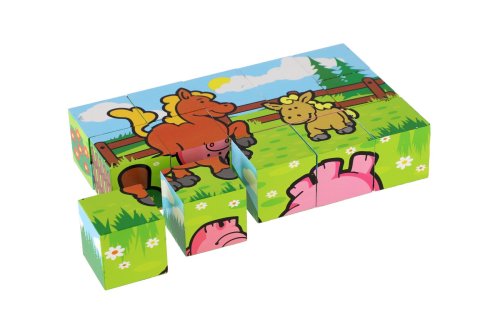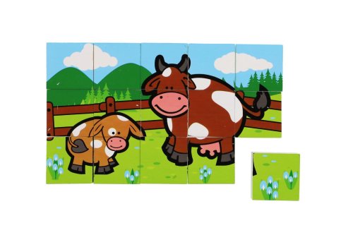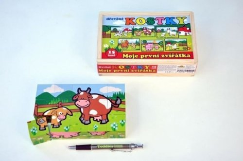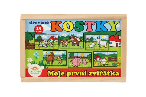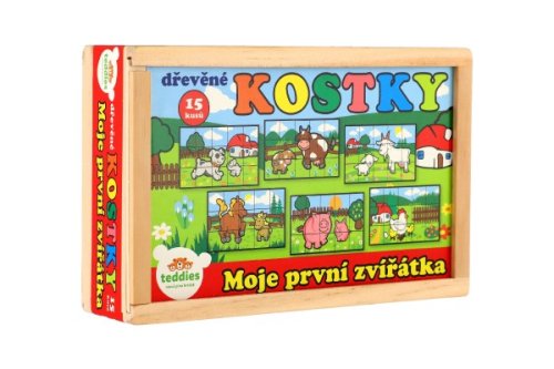 Drevené kocky s farebnými obrázkami domácich zvieratiek sú výbornou voľbou pre najmenších. Pri ich správnom poskladaní sa zobrazí jeden zo šiestich obrázkov, hra tým napomáha rozvíjať u detí logické uvažovanie, fantáziu a jemnú motoriku. Pri stavaní a búraní komínov deti zistia, ako funguje rovnováha a pomôže im to v chápaní príčiny a následku. Obsahuje 15 ks, v drevenej krabičke 20 x 13 x 5,2 cm. Vhodné pre deti od 12 mesiacov.