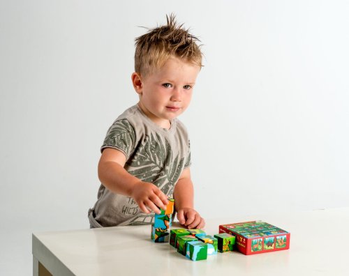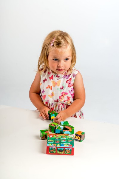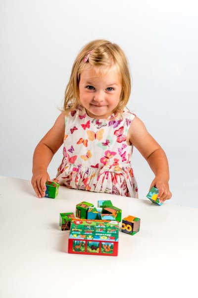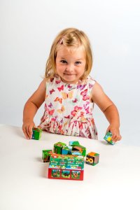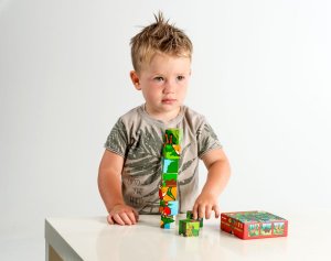Drevené kocky s farebnými obrázkami domácich zvieratiek sú výbornou voľbou pre najmenších. Pri ich správnom poskladaní sa zobrazí jeden zo šiestich obrázkov, hra tým napomáha rozvíjať u detí logické uvažovanie, fantáziu a jemnú motoriku. Pri stavaní a búraní komínov deti zistia, ako funguje rovnováha a pomôže im to v chápaní príčiny a následku. Obsahuje 9 ks, v drevenej krabičke 11 x 11 x 6 cm. Vhodné pre deti od 12 mesiacov.