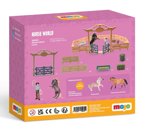 Predstavujeme vám Mojo Westernový ranč Corral s koňom a kovbojom - hračku, ktorá vaše deti prenesie priamo do srdca nekonečných plání a závratných dobrodružstiev. Pripravte sa na cestu, ktorá rozšíri obzory fantázie vašich detí a prinesie domov kus ikonického západu. Vyrobené s láskou a pozornosťou k detailu skúsenými remeselníkmi vo Veľkej Británii. Každá figúrka, od majestátneho koňa po statočného kovboja, je starostlivo modelovaná tak, aby odrážala ich skutočné náprotivky s úchvatnou presnosťou. Ich prvotriedna polyvinylchloridová konštrukcia zaručuje, že vaše dobrodružstvo bude trvať dlho a bezpečne. Mojo Westernový ranč Corral je príležitosť pre deti naučiť sa niečo nové o zvieratách, farme a histórii Divokého západu. Predstavte si, ako tento set pomáha vašim deťom rozvíjať ich kreativitu a poznávacie schopnosti. Hlavné vlastnosti: verné detaily aj sfarbenie odolné prevedenie navrhnuté v spolupráci s komunitou zberateľov súčasťou Mojo Farm & Horses Collection