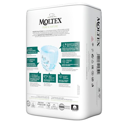 VAROVANIE:Jednorázové plienky Moltex Pure & Nature. Neobsahujú umelé parfémy, latex ani chlór. Dátum spotreby uvedený na obale - Vyrobené v EU spoločnosťou Ontex