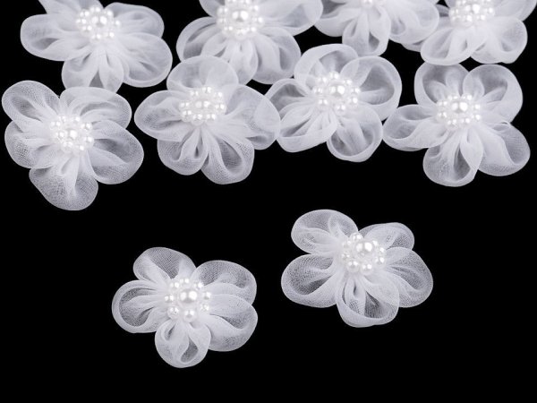 Nežný monofilový kvet je veľmi romantický. V jeho strede sú našité sklenené perličky s perleťovým leskom. [Upozorňujeme zákazníkov, že sklenené perličky sa môžu líšiť, môžu mať rôznu povrchovú úpravu - s leskom, s AB efektom, mierne odlišné odtiene a pod.] Použitie: Kvet môžete našiť ako dekoráciu na odevy, napríklad na spoločenské šaty, blúzky, tričká alebo svetre . Je vhodný aj na zdobenie klobúkov, čiapok a čeleniek do vlasov. Môžete ho tiež pomocou lepidla prilepiť na brošňový mostík a vytvoriť zaujímavý šperk.