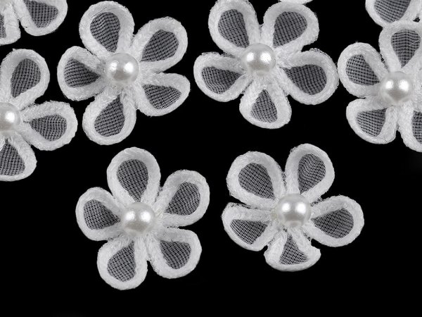 Monofilový kvet so zosilnenými okrajmi pôsobí veľmi romanticky. Jeho stred zdobí nalepená perla. Použitie: Kvet je určený na zdobenie odevov, čeleniek do vlasov a gumičiek.
