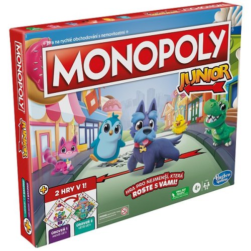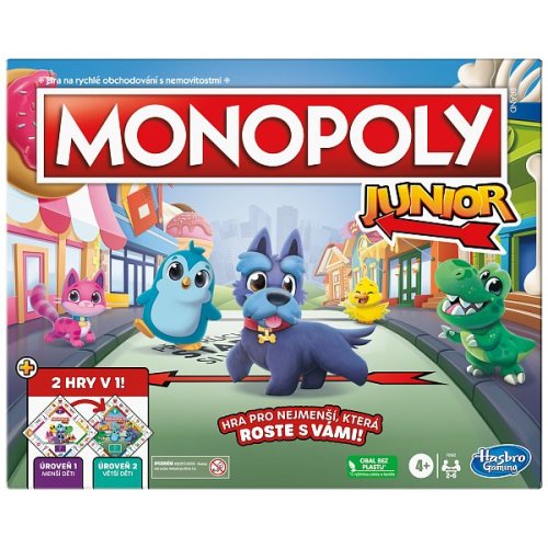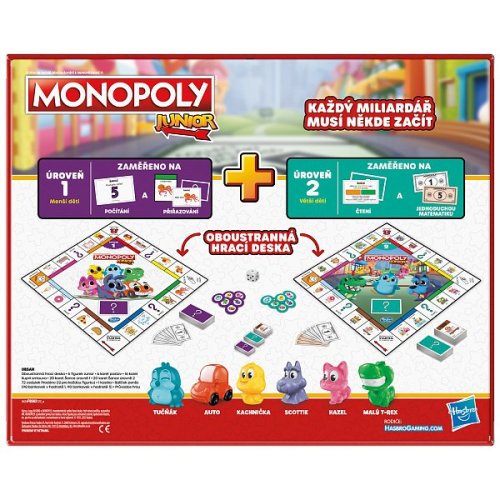 Táto nová verzia obsahuje obojstrannú hraciu dosku pre 2 spôsoby hry! Vďaka jednoduchej hrateľnosti a lokalitám vhodným pre deti je táto hra skvelým vstupom do hry Monopoly. Hra, ktorá rastie s vašimi deťmi! Jedna strana je určená pre mladšie deti (4+), a keď ju otočíte, nájdete pokročilejšiu hru pre starších predškolákov! Hra obsahuje sadu kariet pre každú úroveň. Mladšie deti môžu hrať s dolárovými bankovkami a staršie deti môžu použiť balíček päťdolároviek. Hra obsahuje žetóny inšpirované klasikou a predstavuje 2 nové žetóny.
