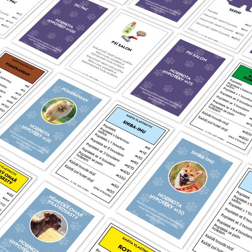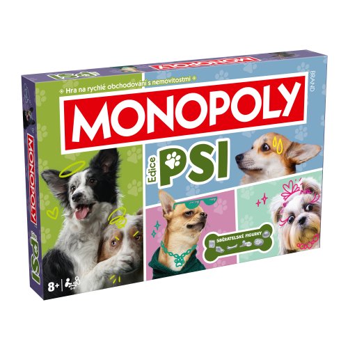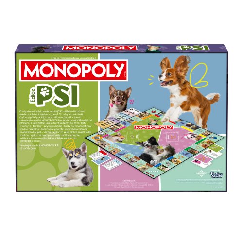 MONOPOLY Psy nová verzia CZ. Spoločenská hra MONOPOLY s tématikou psíkov. Pre 2-6 hráčov. Obsahuje 6 unikátnych zberateľských figúrok. Čo si psy myslia, keď na nás tak pozerajú? Čo robia naši štvornohí miláčikovia, keď odchádzame z domu? O čo by sa s nami náš štvornohý priateľ podelil, keby mal tú možnosť? V tomto podarenom vydaní MONOPOLY PSI objavíte tie najobľúbenejšie psie plemená, a tiež zistíte, aké je to žiť skutočný psí život. Karty „Hračky” a „Maškrty”, skrývajú úsmevné ukážky psej múdrosti pre