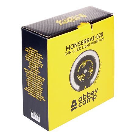 Multifunkčná LED lampa s vetráčikom Abbey Camp Monserrat je perfektný doplnok na kempovanie, na cesty, do kancelárie aj do bytu. S touto multifunkčnou lampou máte nielen dostatok svetla, ale môžete ju využiť aj ako ventilátor a powerbanku! Lampa je odolná proti striekajúcej vode a má vstavanú Li-ion batériu. Lampa 3v1 sa skladá zo 4 LED svetiel a lampu môžete používať v rôznych režimoch - tlmené svetlo, jasné svetlo, svetlo odpudzujúce komáre a reflektor. Vďaka tlmenému svetlu môžete svoje kempovanie skutočne zútulniť. Jasné svetlo poskytuje funkčné osvetlenie a dobrú viditeľnosť. Navyše je k dispozícii žlto sfarbený režim, ktorý pomáha odpudzovať komáre . Reflektor môžete použiť ako baterku v tme, ale aj ako svetlo na čítanie. Vetrák môžete používať aj v rôznych režimoch. Okrem svetla a vetráka funguje tento produkt aj ako powerbanka. Pomocou USB-c vstupu môžete ľahko nabíjať rôzne zariadenia. Kempingové svetlo môžete zavesiť pomocou plastového háčika na zadnej strane a postaviť ho na výšku na stôl, stôl alebo pult. Kempingová lampa sa nabíja cez USB a je dodávaná s nabíjacím káblom. - materiál: ABS - 3 v 1: LED svetlo, ventilátor, powerbanka - 2 tlačidlá na prednej strane - 3 rýchlosti ventilátora: pomalá, stredná a rýchla - stmievateľné svetlo 70-150 lúmenov, 6500k teplota svetla - 4 LED režimy: tlmené svetlo, jasné svetlo, svetlo odpudzujúce komáre, bodové svetlo - plastový háčik - Port USB-c na nabíjanie zariadenia - vstavaná Li-ion batéria 4000 mAh - USB-c dobíjací, kábel súčasťou balenia - doba vybíjania: svetlo 7,5 - 14 hodín, ventilátor 5,5 - 13 hodín - doba nabíjania: < 6,5 hodiny - rozmery: 20 x 19,5 x 6,3 cm