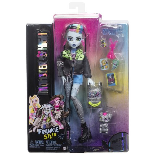 Príšerka monštierka Frankie™ z Monster High™ je vo svojom elektrizujúcom džínsovom oblečení ikona strašidelného módneho štýlu! Psí maznáčik Watzie™ stojí ako vždy verne po jej boku. Bábika Frankie Stein™ s kĺbovým telom a jedinečnými doplnkami na rozprávanie príbehov je skvelým darčekom pre deti od 4 rokov. Bábika nemôže stáť sama. Farby a dekorácie sa môžu líšiť.