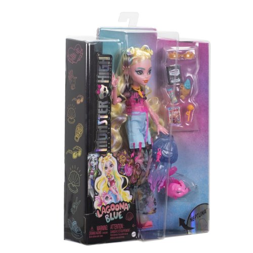 Príšerka monštierka Lagoona™ z Monster High™ je fantastické morské monštrum! Lagoona Blue™ vyžaruje neuveriteľne cool štýl vo svojom oblečku, jej maznáčik piraňa Neptúna vyzerá rovnako skvele! sa môžu líšiť.