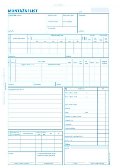 Montážny list - OP - 1277. Tlačivo je nepropisovací a nečíslovaný. Formát A4 na výšku. Obsahuje 100 listov odtržiteľných perforac