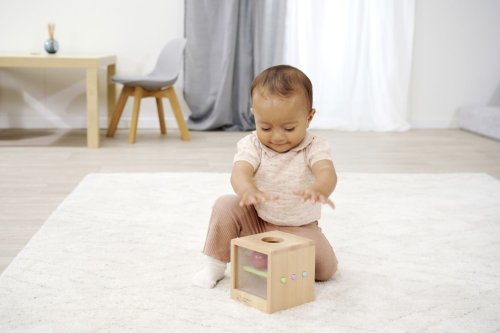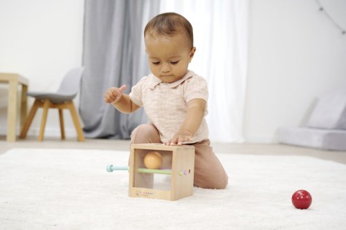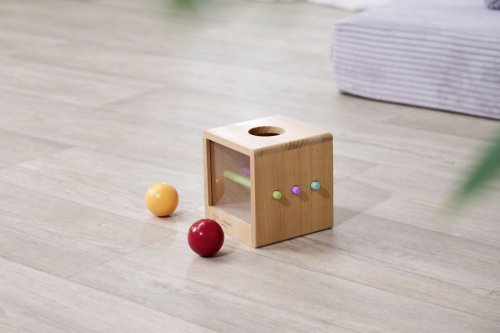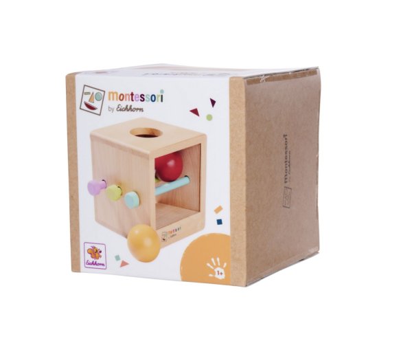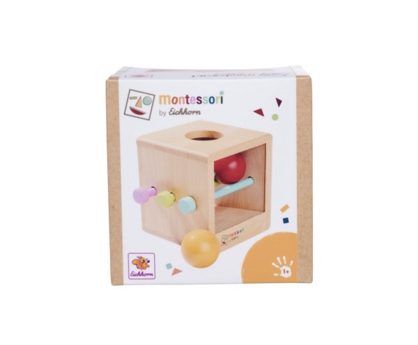Montessori box je všestranná vzdelávacia hračka. Drevená sada sa skladá z kvalitného boxu s priezorom, 3 tyčiek a 2 farebných gulí. Keď sú tyčky zasunuté v boxe, guľa sa po vhodení do otvoru zasekne vo vnútri. Vytiahnutím tyčiek sa guľa vykotúľa von. Variant pre mladšie deti: bez zasunutých tyčiek – vhoďte guľu do otvoru a sledujte, ako sa kotúľa von. Montessori box je vyrobený zo 100% bukového dreva s certifikátom FSC a je vhodný pre deti od 1 roku.