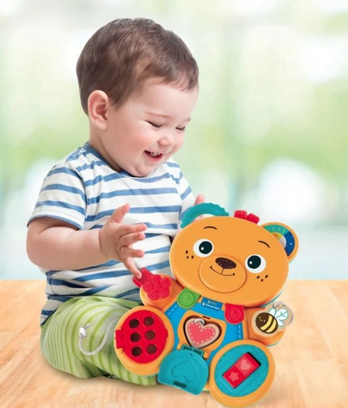 Roztomilý panel vyrobený z recyklovaného plastu s drevenými prvkami. Aktivity sa zameriavajú na Montessori prístup, na stimulovanie manuálnu zručnosť batoliat, oko-ruka koordináciu a koncentráciu. Balenie: 29x35x5, 5cm. Vek: 18m+