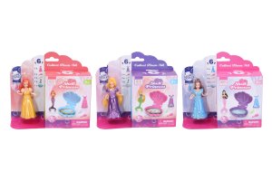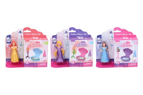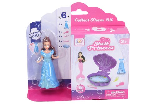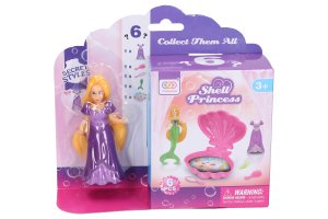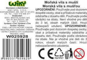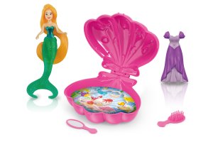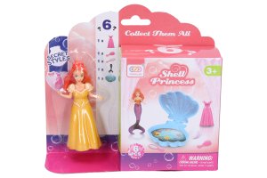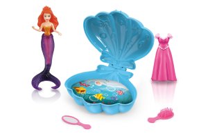 Morská víla s mušľou. Veľkosť 9,5 cm. Súčasťou víla, mušle, šaty, zrkadlo, hrebeň. 3 farebné varianty mušle - žltá, modrá, fialová.