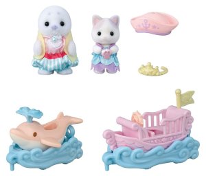 Zažite vzrušujúce dobrodružstvo s touto sadou Sylvanian Families. Jazda na vlnách, kde sa vzrušenie snúbi s predstavivosťou. Táto živá a dynamická jazda vás vezme na cestu po vlnách a vzrušujúcich zákrutách. Súprava obsahuje dve figúrky baby tulene Puffy Floater a baby Latte mačky Cara Fontana, ktoré majú na sebe roztomilé oblečky vrátane parádnych doplnkov – klobúka a korunky. Morské vozítka v podobe loďky a delfína sa počas jazdy pohybujú a dodávajú celej hre ešte kúzelnejší efekt. Morské vozítka je možné navyše spojiť dohromady. Celá sada je v jemných pastelových farbách. Hračky Sylvanian Families rozvíjajú predstavivosť a povzbudzujú deti k hraniu rolí. Hra s figúrkami rozvíja kreativitu a učí emóciám vytváraním a rozprávaním príbehov založených na každodenných zážitkoch a pozorovaní sveta. Vyznačujú sa najvyššou kvalitou a výnimočným dôrazom na detaily. Figúrky Sylvanian Families sú pokryté mäkkým semišom, majú pohyblivé končatiny a hlavu. Oblečenie je možné z figúrok zložiť a vymeniť za iný outfit. Balené v krabičke. Rozmery balenia: 13 x 14,6 x 5,5 cm. Vek: 3+