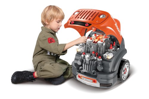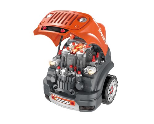 Motor skrutkovací na diaľkové ovládanie - terénne auto. Rozmery 40x39x47 cm. Obsahuje 61 súčiastok. Kľúče na diaľkové ovládanie (tlačidlá pre odomknutie, zamknutie, klaksón). Infračervený port. Svietiace predné svetlá, klaksón, radiaca páka, výstražné svetlo, štartovacie tlačidlo, odklápacia kapota, osvetlenie motora, meranie oleja. Svetelné a zvukové efekty. 3xAA pre motor nie sú súčasťou, 1xCR2025 (3V) pre kľúče súčasťou.
