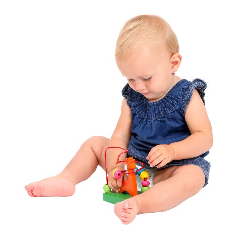 Labyrint so žirafkou na drevenom podklade pomáha deťom nielen zoznamovať sa s farbami, ale predovšetkým trénovať jemnú motoriku pri posúvaní korálikov.