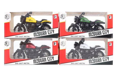 Kovový model motorky o rozmere cca 10 x 6,5 x 5 cm. Rozmer balenia cca 14,5 x 7 x 6 cm. Vek 3+
