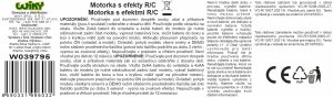 Motorka s efektmi RC na diaľkové ovládanie. Rozmery 23x11x19 cm. Ovládač v tvare riadidiel. Frekvencia 2.4GHz. Svetelné a zvukové efekty. 4xAA batérie do vyťahovacieho plastového boxu zo zadnej strany motorky, 2xAA do ovládača nie sú súčasťou. Prepínač ON/OFF na spodnej strane motorky a na ovládači. Ovládač - pohyb všetkými smermi, tlačidlo - demo režim (podržaním 3 sekundy - vypnutie/zapnutie zvukových efektov.