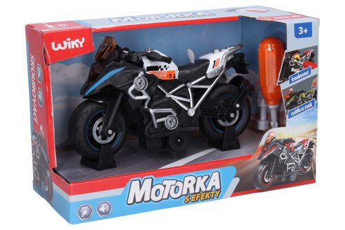 Motorka skrutkovacia s efektmi biela. Rozmery 20x8,5x12 cm. Na zotrvačník. Svetelné a zvukové efekty zatlačením zadnej časti motorky dole. 3xAG13 batérie súčasťou. Obsahuje motorku, skrutkovač, kľúč.