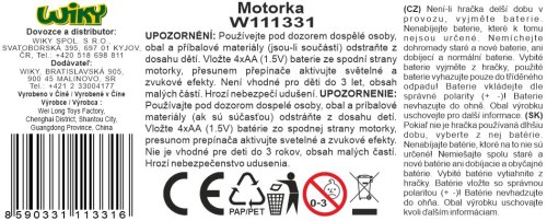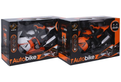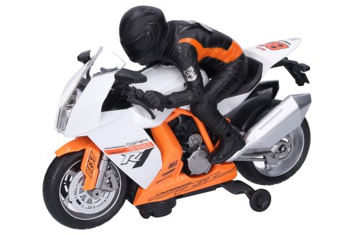 Pretekárska motorka s figúrkou jazdca. Veľkosť 28 cm. Svetelné a zvukové efekty. 4xAA batérie nie sú súčasťou. 2 varianty - oranžová, biela.