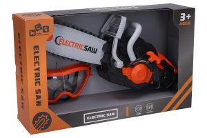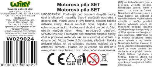 Motorová píla a ochranné okuliare. Veľkosť píly 34 cm. 3xAA nie sú súčasťou. Vydáva zvukové efekty. Aktivácia tlačidlom na ľavej strane.