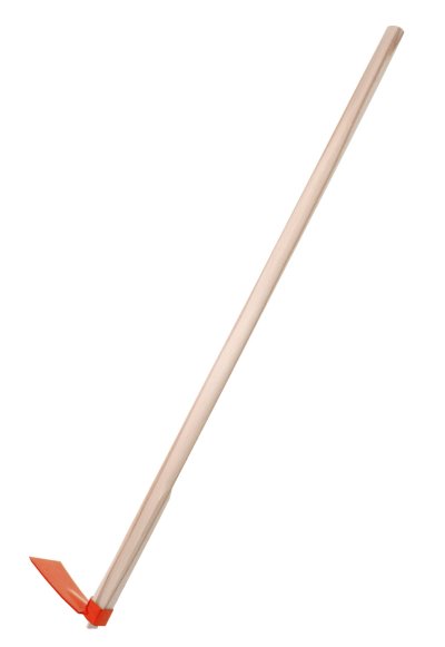 Plochá okopávací motyka s pracovnou časťou v kovovom prevedení, s drevenou násadou.