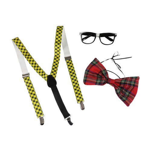 Originálna sada pre všetkých elegánov! Karnevalová sada obsahuje motýlika na šnúrku, okuliare a traky. Veľkosť motýlika je cca 20 cm. Perfektné kúsky na párty!