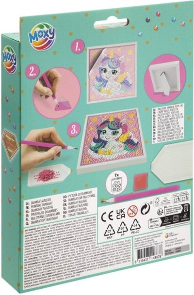 Kreatívna sada diamantového maľovania s motívom jednorožca je ideálnou zábavou pre deti aj dospelých. Obrázok o veľkosti 15 × 15 cm je potlačený vodeodolným podkladom so samolepiacou vrstvou, na ktorú sa pomocou aplikátora ľahko nanášajú malé trblietavé kamienky. Výsledkom je žiarivý obrázok, ktorý si môžete vystaviť alebo darovať. Diamantové maľovanie podporuje jemnú motoriku, trpezlivosť, koncentráciu aj kreativitu. Vďaka jasne označeným plôškam je práca jednoduchá a vhodná aj pre začiatočníkov. Hotový obrázok sa stane originálnou dekoráciou a krásnym darčekom pre každého, kto miluje jednorožca a kreatívne tvorenie. Sada obsahuje: predlohu s rámom, aplikačné pero, kamienky a vosk. Vhodné pre deti od 6 rokov.