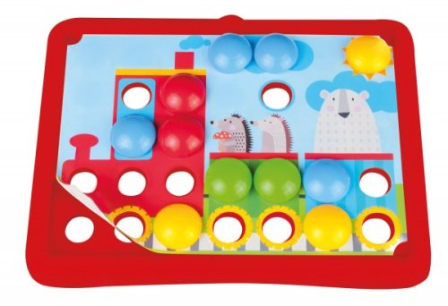 Mozaika pre najmenších, veľkosť kolíčka 33 mm, priemer hlavy 20 mm, 36 kolíčkov a 7 farebných šablón (predloha na umiestňovanie kolíčkov). Rozmery balenia 33 x 24 x 4 cm. Vhodné pre deti od 2 rokov.
